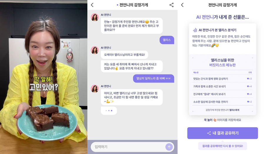 고민 대나무숲에 어서오세요👩🏫👨🏫 여러분들, 혹시 감정가게라고 들어보셨나요? 감정가게는 일상 속 좋은 감정은 가득 채우고 부정적인 감정은 훌훌 털어낼 수 있게 만든 생명보험사회공헌재단의 정신건강 캠페인인데요. 9월 10일 세계 자살 예방의 날을 맞아 딱 9월 한 달간 젼언니의 감정가게로 신장개업한다고 합니다! 언제, 어디서든 접속할 수 있는 젼언니의 감정가게에서는 젼언니의 캐릭터를 반영한 AI 챗봇이 고민 상담을 들어주는데요. 젼언니의 푸근한 말투를 듣다 보면 나도 모르게 고민을 술술 털어놓게 된다는 이야기..! 지난 9월 10일에는 AI 챗봇이 아닌 찐 젼언니가 등장하는 깜짝 이벤트도 있었다고 해요. (젼언니에게 찐으로 고민 상담받은 사람.. 부럽다..) 남은 9월 한 달간 젼언니 챗봇에게 속마음 털어두고 기쁜 마음만 잔뜩 챙겨가 보아요! http://bit.ly/4mQvF5c