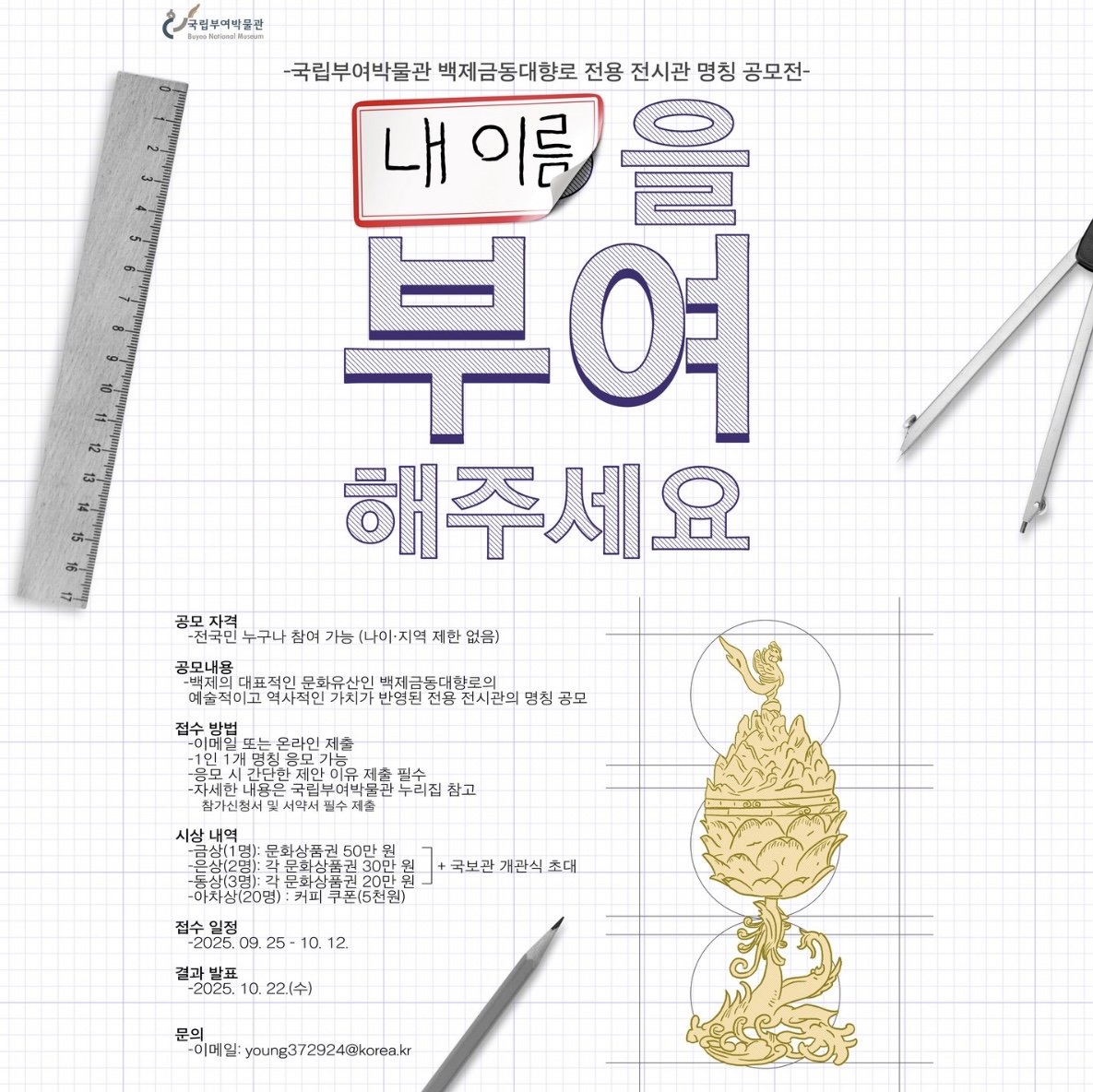 이미 마음은 집, 혹은 고향에 가 있는데 시간 참~ 안 지나간다 그죠? 그럴 땐 정신을 다른 곳에 두면 시간이 빨리 가는데요. 시간도 때우고 의미 있는 공모전에도 참여하고, 어때요? 국립부여박물관에서 백제 공예예술의 정수, 백제금동대향로 전용 전시관의 이름을 공모하고 있답니다. 백제금동대향로의 예술, 역사적 가치를 담은 이름이 주제이고 1인당 1개의 명칭을 제출할 수 있어요. 안 가는 시간, 멋진 유물을 위한 공간의 이름을 생각해 보며 보내는 건 어때요? 글재주가 없어 잘 못하겠다고요? 명칭 1개에 50자 내외의 설명만 적으면 끝! 앨리스의 글 한 꼭지가 400자 정도니까 글재주, 말주변 없어도 50자는 채울 수 있을 거예요! 운 좋으면 상도 타고 이름도 채택되고! 시간도 가고!