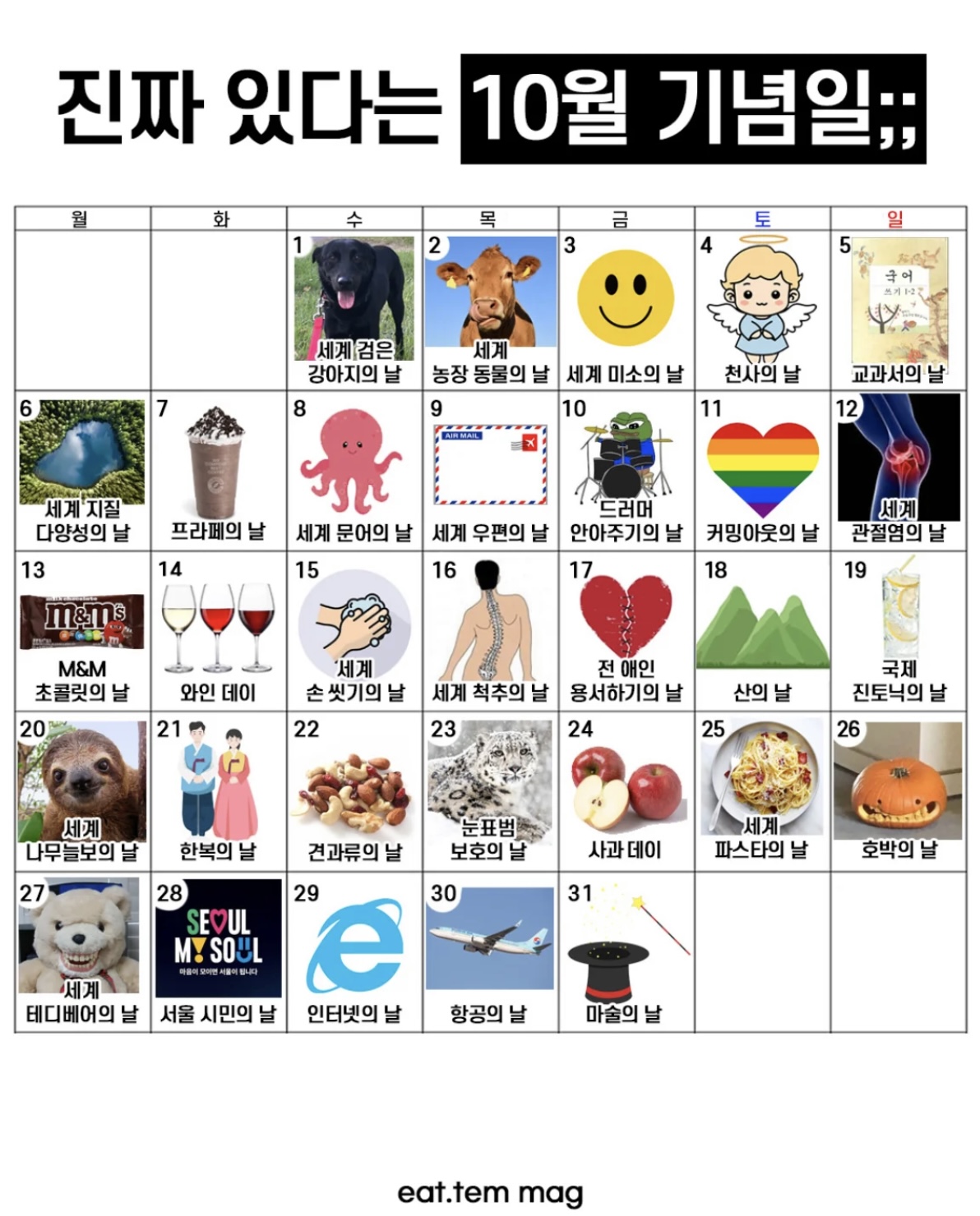 10월에 어떤 기념일이 있는지 아시나요? 추석이나 한글날, 개천절 같은 모두가 잘 아는 그런 기념일 말고요! 이 계정에서는 생소하지만 존재하는 특이한 기념일에 대해 알려주고 있어요. 가끔 은행에서 나눠주는 커다란 벽걸이 달력에 특이한 기념일이 적혀있곤 했는데.. 10월 중 하루도 빠짐없이 다양한 기념일이 존재하는 건 앨리스도 처음 알았어요! 기념일을 좀 더 기억하기 위해 일자 말고 기념일로 말해볼까요? 구독자 여러분, 즐거운 추석 보내고 세계 척추의 날에 다시 메일함에서 만나요!