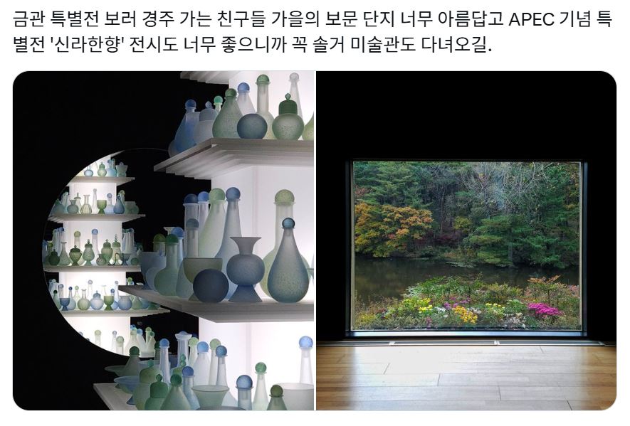 APEC으로 경주라는 도시에 대한 관심이 참으로 많았던 11월의 시작이었죠? 그중에서 대중들의 많은 관심을 받은 건 역시 여섯 점의 금관이 한자리에 모인 특별 전시가 아닐까 싶어요. 주변에서도 금관 전시를 보러 경주를 방문하겠다는 사람들만 한 트럭..! 앨리스도 전시가 끝나기 전에 가 보는 게 목표인데요. 금관 전시도 좋지만 경주솔거미술관에서 열리는 중인 <신라한향>전시도 멋지다는 소식도 접했답니다. 앨리스처럼 금관을 노리고 경주를 방문한다면 이곳도 경로에 넣어보면 어떨까요?